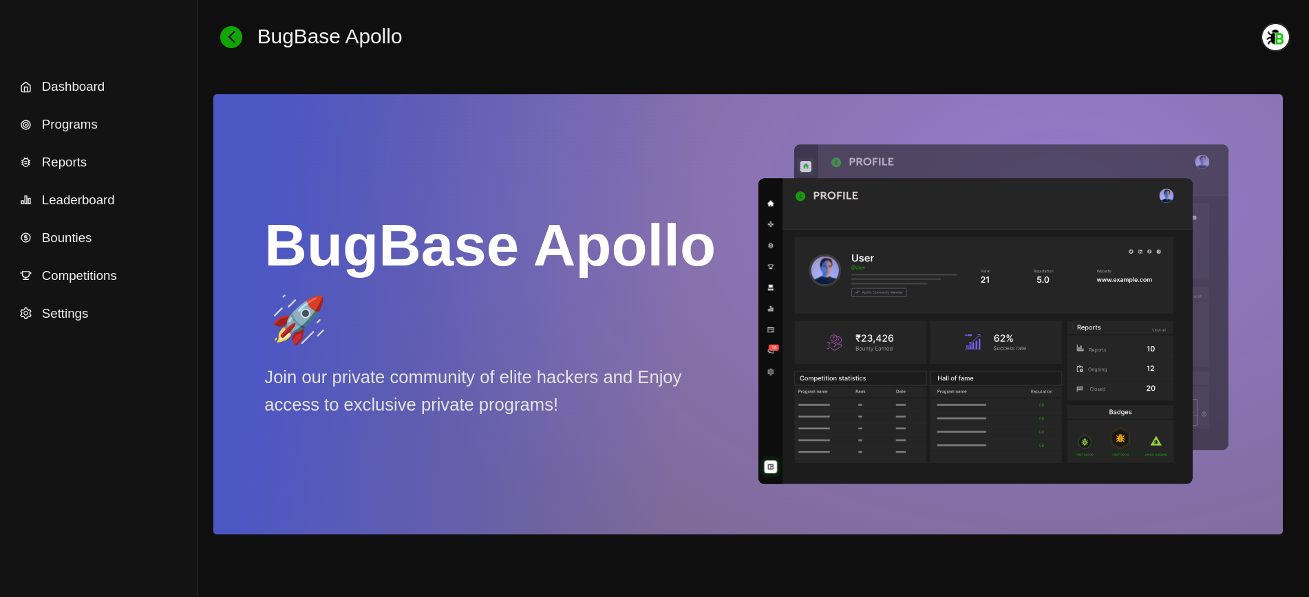 BugBase Apollo is a community of elite hackers who are passionate about security and have a proven track record of finding vulnerabilities. If you are one of them, we would love to have you in our community.