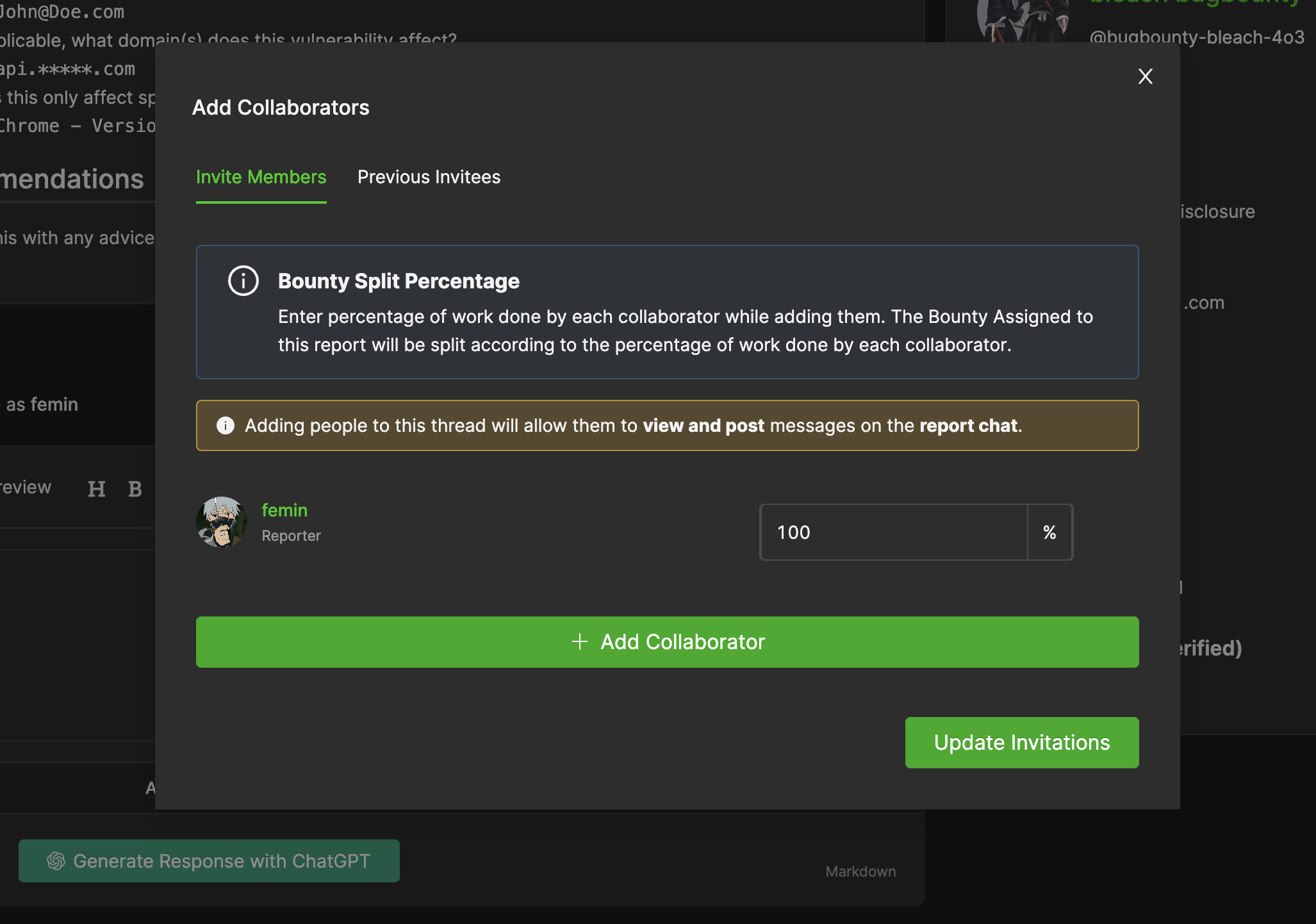 To add a hacker as a collaborator, their BugBase username along with the bounty split percentage should be provided in the dialog box