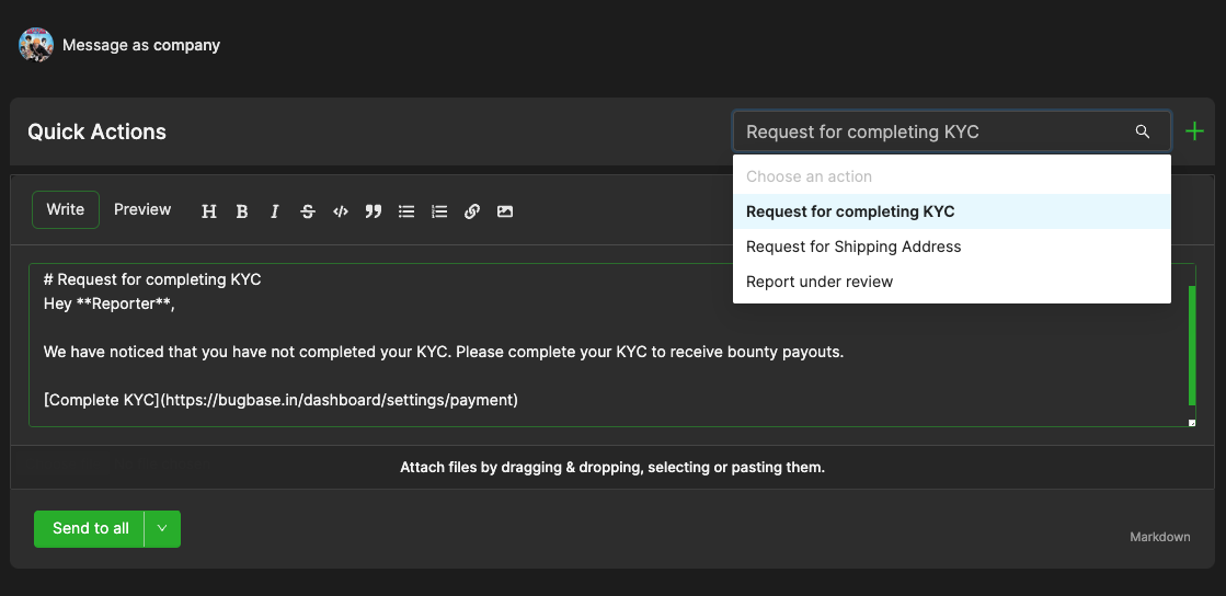 * `Request for completing KYC`: This quick action can be used to let the hacker know that they need to complete their KYC to receive bounty payouts.