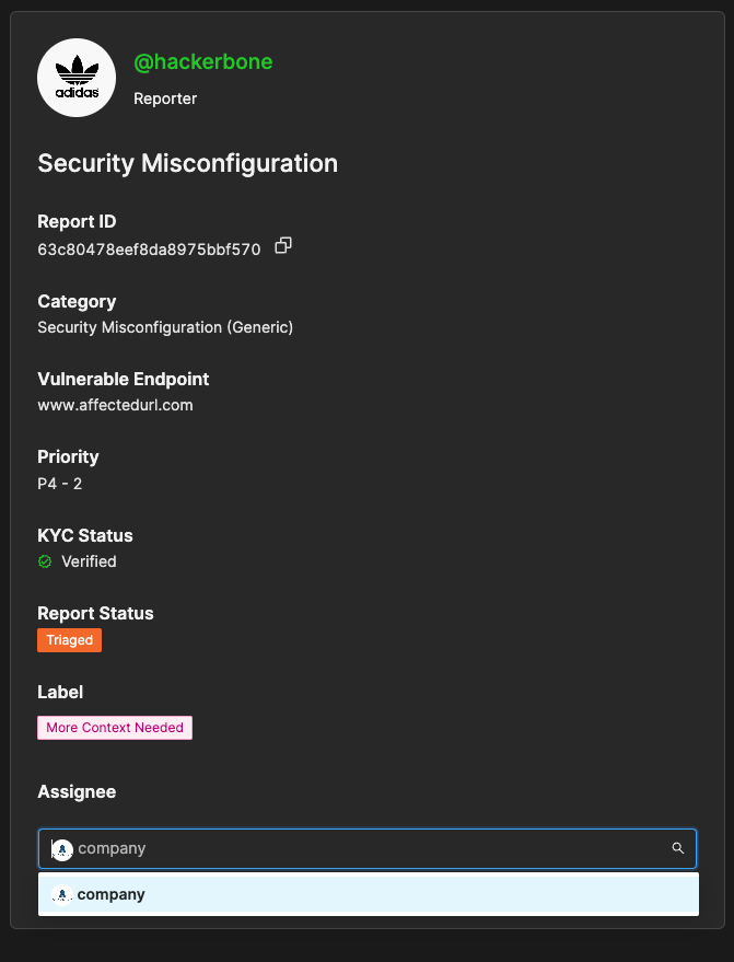 Program managers can assign a report to a specific team member for further triage and investigation. This allows program managers to delegate responsibility for investigating and addressing vulnerabilities to specific team members.